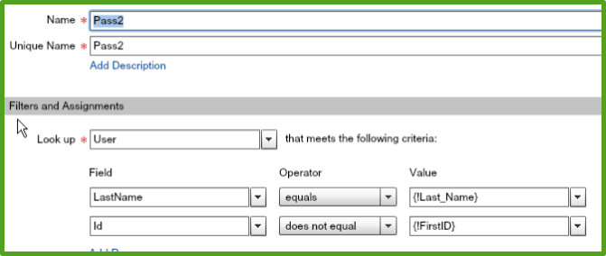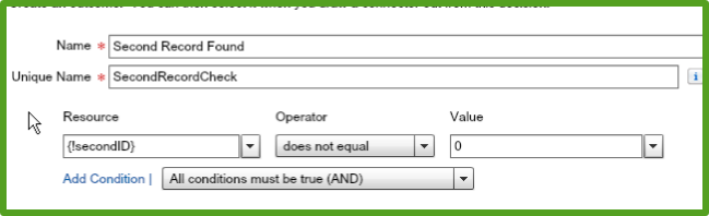 The flow will next do a name check via the decision function. If the Formatted Jaeger Name contains the current matched pair, the flow adds a value of 1 to the counter variable and adds the current pair to a variable that will show the matches and the ID of the current record to another variable. Ugh, that was hard to read, here is a picture: